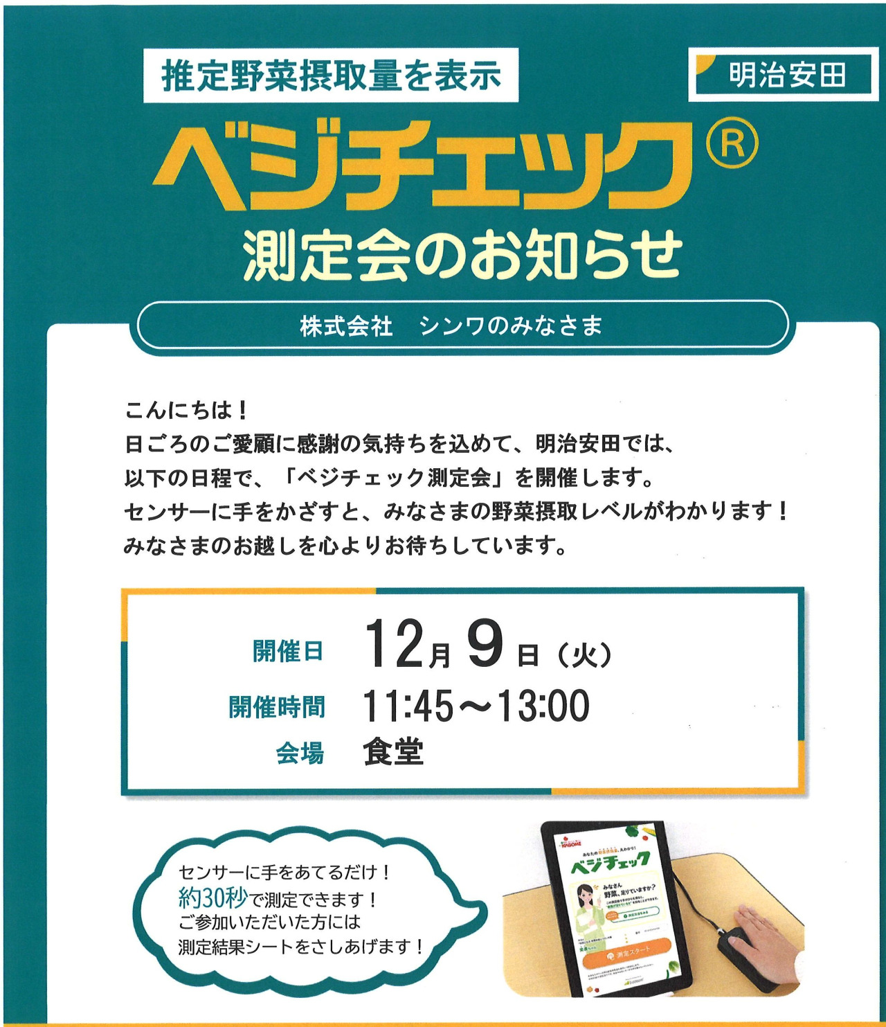 「健康経営」の取り組みの一つとして、前回に引き続き、明治安田生命様にご協力をいただき「ベジチェック測定会」(前回の推定野菜摂取量の従業員平均値が5.2とかなり低かったので、リベンジとして)を開催しました。